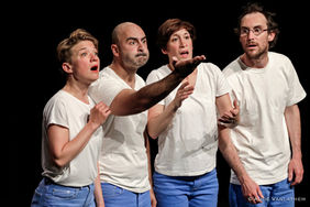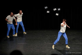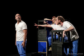 c’est la crise : les comédien·nes y ont cru jusqu’au bout, mais ils n’ont rien à présenter ce jour-là. Iels vont devoir annuler la représentation. Sauf qu’un des comédiens a appelé le public à l’aide. Les spectateur·trices ont entre leurs mains la clef du problème : des enveloppes scellant des propositions qui serviront à créer un nouveau récit. Une à une, ces enveloppes vont être ouvertes par les comédien·nes qui vont créer, dans un premier temps, de petites séquences pour donner corps à ces idées. Les comédien·nes vont acquérir devant le public la capacité à imaginer, décrire, faire ressentir des choses qui n’existent pas. Iels combinent des idées, créent un vocabulaire commun de sons, de mouvements, de personnages qui seront utilisés pour la suite du spectacle.